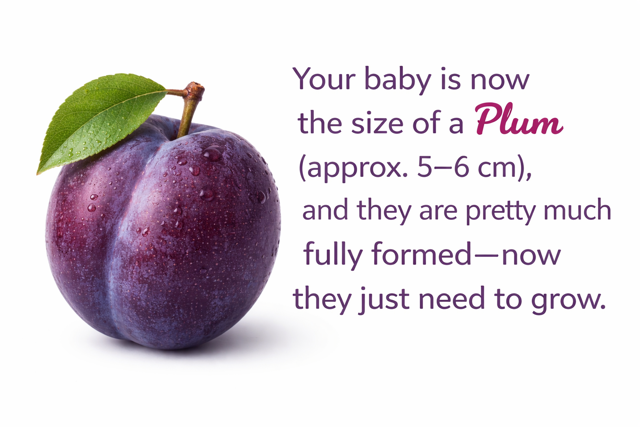 Your baby is now the size of a Plum (approx. 5‑6 cm), and they are pretty much fully formed—now they just need to grow.