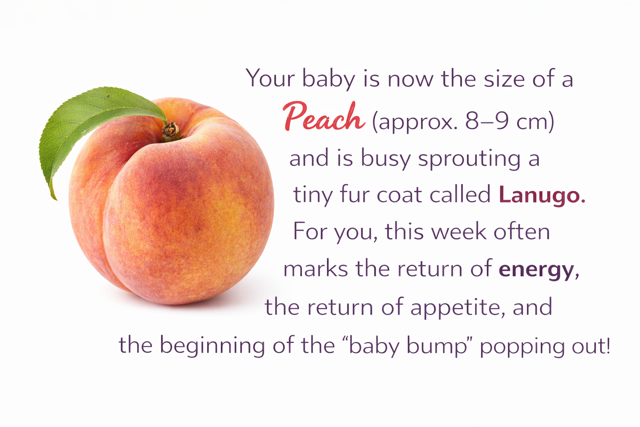 Welcome to the Second Trimester! You have officially crossed the bridge from "survival mode" to the "growth zone." Your baby is now the size of a Peach (approx. 8‑9 cm) and is busy sprouting a tiny fur coat called Lanugo. For you, this week often marks the return of energy, the return of appetite, and the beginning of the "baby bump" popping out!