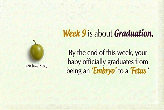 If Week 8 was about shaping the body, Week 9 is about Graduation. By the end of this week, your baby officially graduates from being an "Embryo" to a "Fetus." This is a massive biological milestone!